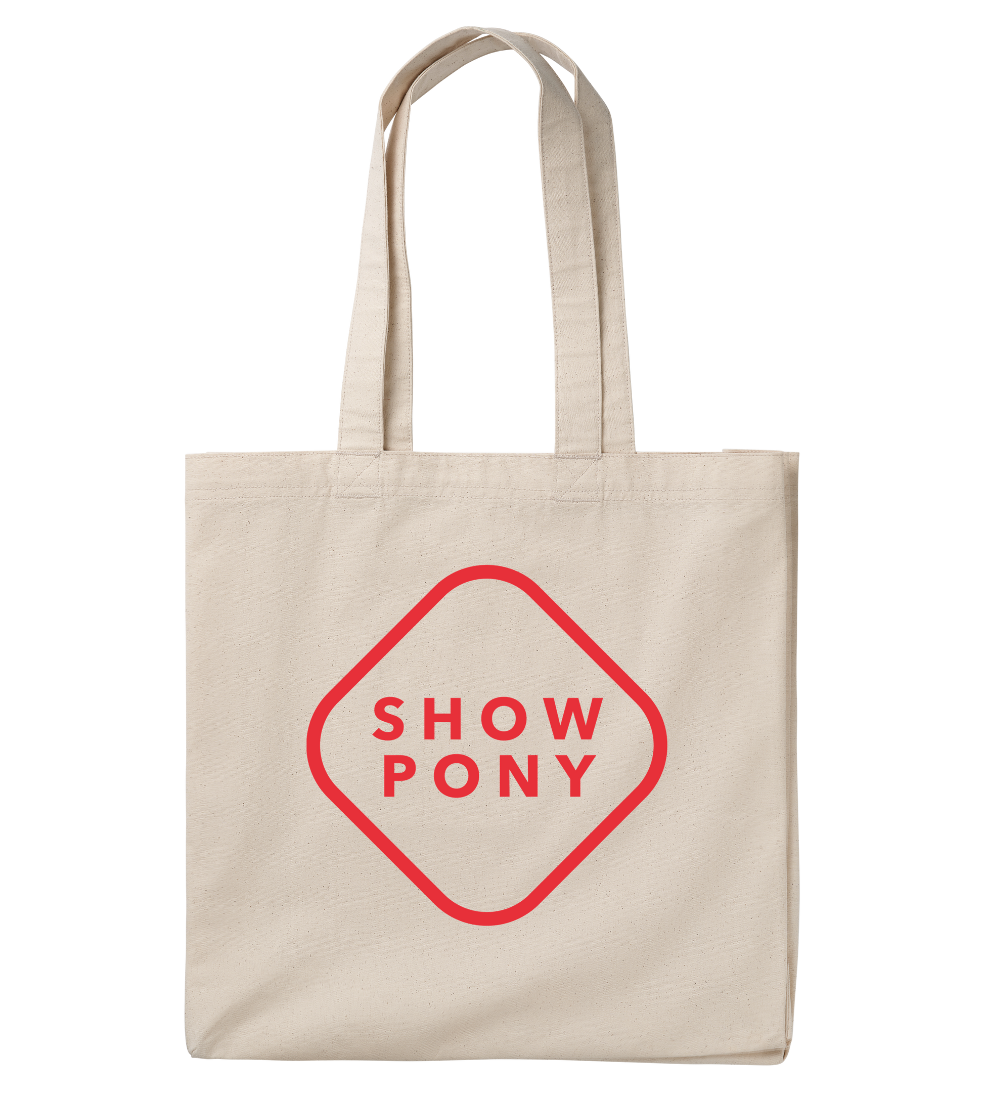 De tote bag met het Showpony beeld merk. Deze grote draagtas heeft een gevormd bodempaneel, voor extra structuur en volume, en twee brede handvatten van katoenen canvas. Het wordt gevoerd, open aan de bovenkant en heeft een binnenzak met metalen drukknoopsluiting. Andere hoogtepunten zijn de tweenaalds doorstiksteek, de éénnaalds doorstiksteek, de gekapte zijnaad, verstevigingsstiksels en de duurzame trens bij de handvatten.